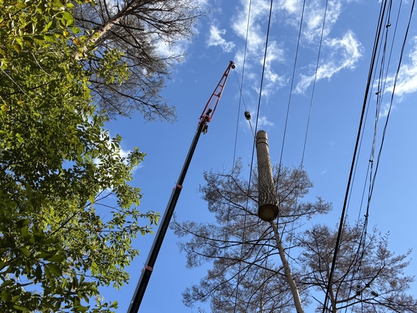 当社では、四国電力送配電さま関連の電気通信設備周辺にて支障木の伐採作業を行っています。安全帯・ロープワーク・声かけの徹底など、安全意識を高めた作業で、ライフラインを守る究極の裏方として電線や光ケーブルの安全確保に必要な伐採・枝払いを日々行っています。